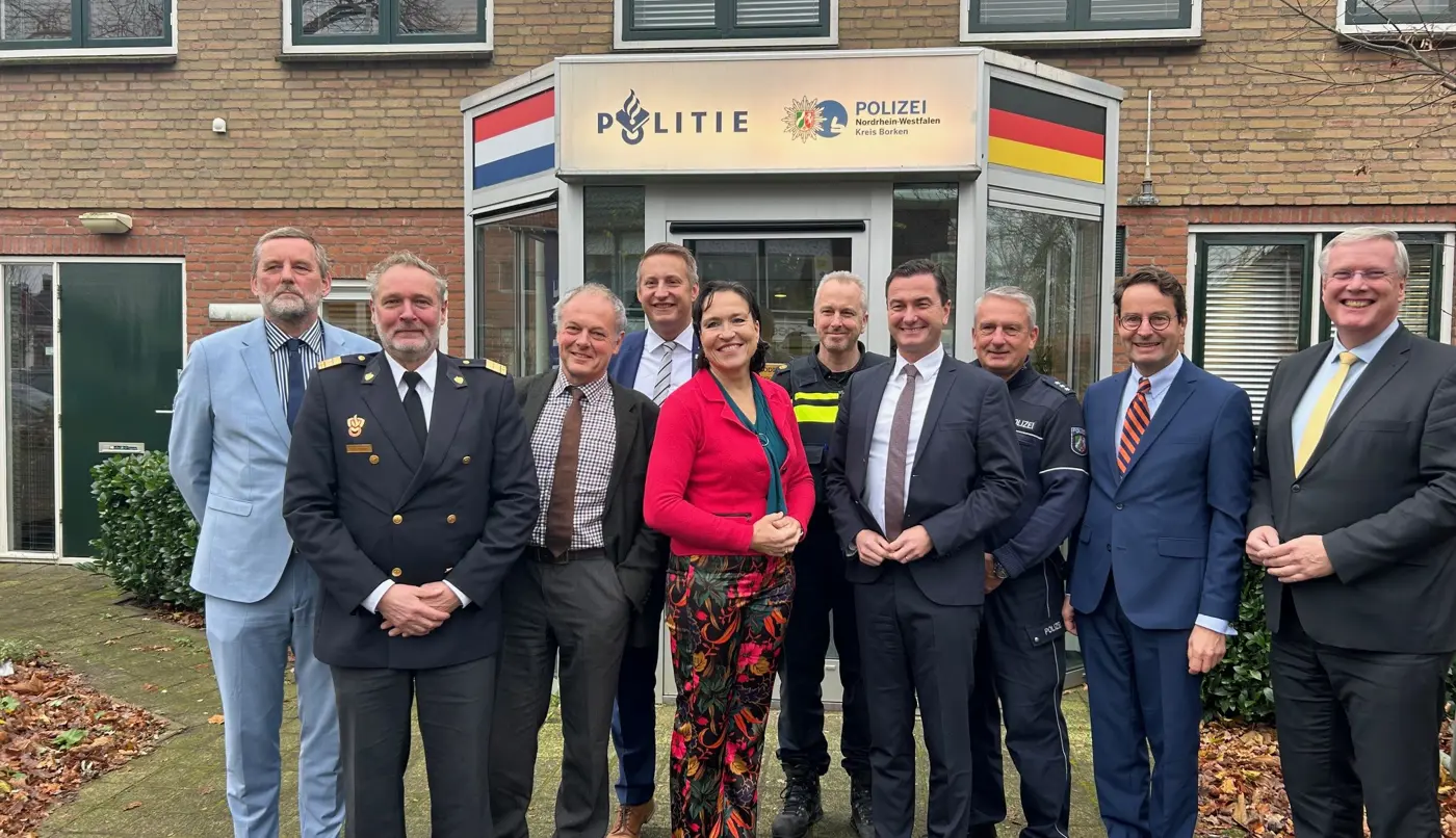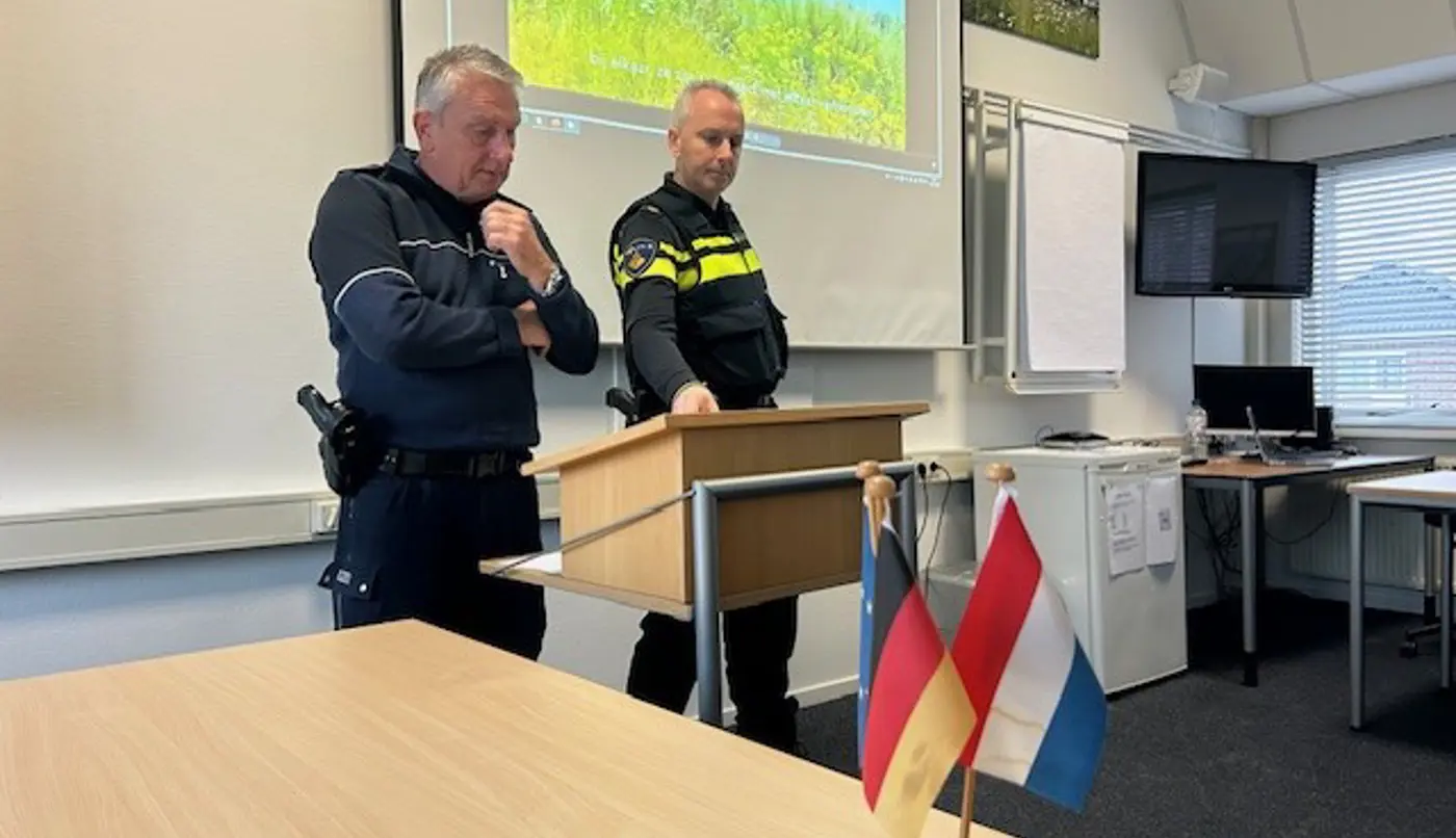 Na het welkomstwoord in de Raadszaal van Dinxperlo namen commissaris van de Koning van Gelderland Henri Lenferink en de Aaltense burgemeester Anton Stapelkamp de aanwezigen mee naar de Nederlands-Duitse politiepost, die in september 2024 haar 25-jarig jubileum mocht vieren en een lichtend voorbeeld voor een gezamenlijke brandweerkazerne is. Wijkagent Arjen Donderwinkel en zijn Duitse collega Jürgen Schütte vertelden meer over het unieke karakter van hun werkzaamheden en de bijzonderheden en uitdagingen die zij dagelijks tegenkomen. Zo kunnen Nederlanders bij ‘geen spoed, wel politie’ bellen naar het speciale landelijke nummer 0900-8844 en worden dan verbonden met het dichtstbijzijnde politiebureau. Beide wijkagenten pleiten ook in Duitsland voor een dergelijk uniform nummer dat de oosterburen nog niet kennen. Ook hun ervaringen met de grenscontroles, die in september van dit jaar al door Duitsland werden ingevoerd en vanaf 9 december a.s. ook door Nederland, kwamen aan bod. De agenten gaven aan dat het nut van de grenscontroles in de praktijk nog bewezen moet worden.