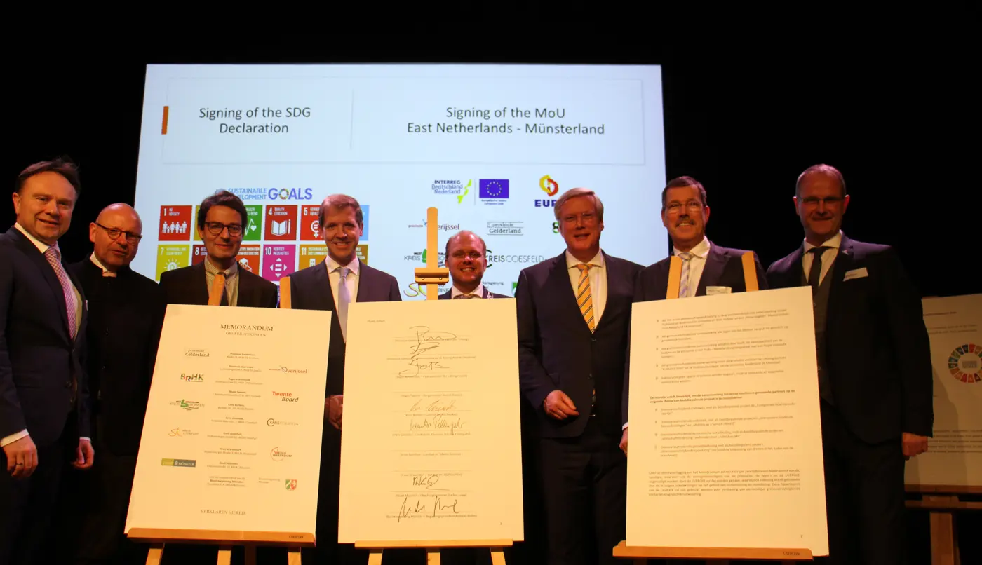 Omdat langdurige en duurzame samenwerking bij het behalen van de SDG’s cruciaal is, werd op deze bijeenkomst ook een Memorandum of Understanding Oost-Nederland Münsterland ondertekend. Ondertekenaars waren de EUREGIO, de provincies Gelderland en Overijssel, de regio’s Twente en Achterhoek, stad Münster en de Landkreise Warendorf, Steinfurt, Coesfeld en Borken. Hierin staan afspraken over samenwerking op het gebied van Euregionaal onderwijs, krapte op de arbeidsmarkt, Nederlands-Duitse fietspaden en grensoverschrijdende ambulancezorg. “We maken afspraken die in het belang zijn van Gelderlanders”, gaf Peter van ’t Hoog, gedeputeerde van de provincie Gelderland, aan. “Want hiermee zorgen we onder meer dat onze inwoners in Nederlandse en Duitse ziekenhuizen goed worden geholpen. Daarmee maak je Oost-Nederland nog aantrekkelijker om in te leven.”