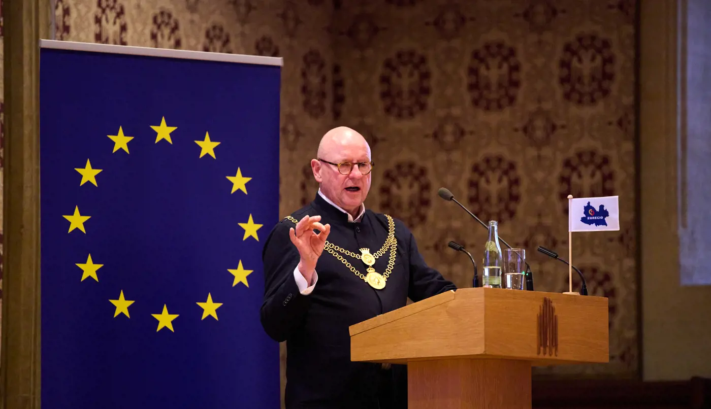 Oberbürgermeister Markus Lewe van Münster en EUREGIO-voorzitter Joris Bengevoord (burgemeester van Winterswijk) verwelkomden de aanwezigen. Prof. dr. Jacco Pekelder (directeur van het Zentrum für Niederlande-Studien van de Universität Münster) gaf vervolgens een lezing over Europa en de samenleving in het Europese verkiezingsjaar 2024.
