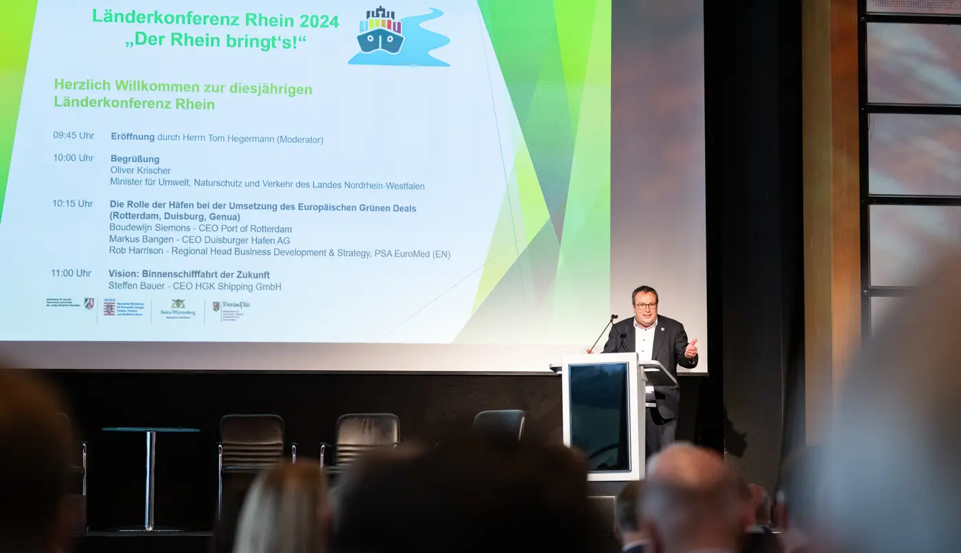 ‘Der Rhein bringt’s’ was het motto van de zevende Länderkonferenz Rhein 2024, die dit jaar op uitnodiging van de minister-presidenten van de deelstaten Noordrijn-Westfalen, Baden-Württemberg, Hessen en Rijnland-Palts op de Rheinterrassen in Düsseldorf werd gehouden. Het belang van de Rijncorridor als een van de centrale vervoers- en logistieke assen van Europa voor het Duitse en West-Europese bedrijfsleven alsmede de bijdrage van de binnenscheepvaart aan een duurzame transportketen werden benadrukt. Kers op de taart was de ondertekening van de intentieverklaring ‘Perspectief duurzame Rijnvaart 2030’ door onder andere de vier hierboven genoemde deelstaten, de provincies Gelderland, Overijssel, Limburg, Noord-Brabant, Utrecht, Noord-Holland en Zuid-Holland en diverse andere stakeholders. Naast overheden onderschreef ook het grotere en middelgrote bedrijfsleven de verklaring.