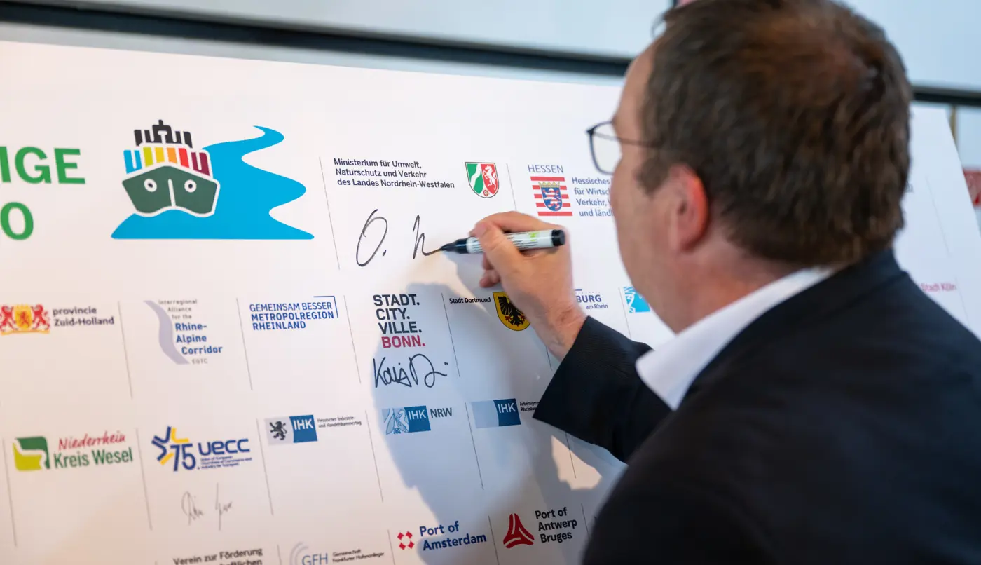 Hoogtepunt van de dag was de ondertekening van de intentieverklaring ‘Perspectief duurzame Rijnvaart 2030’. Daarmee wordt een proces gestart om in de komende twaalf tot vijftien maanden doelen en maatregelen uit te werken die klimaatvriendelijke binnenvaart op de Rijn stimuleren en ervoor zorgen dat meer goederen via het water in plaats van via weg en spoor worden vervoerd. In een level playing field van het ‘Systeem Waterweg’ moeten klimaatvriendelijke technologieën, voldoende geschikte overslagplaatsen en efficiënte planning- en vergunningprocedures worden ontwikkeld, beschikbaar gesteld en toereikend gefinancierd. Alle belanghebbenden dienen daarmee uiteindelijk te kunnen beschikken over een perspectief op een duurzame, betrouwbare en concurrerende scheepvaart op de Rijn en de aansluitende waterwegen. Het uiteindelijke doel is een groene binnenvaartcorridor op de Rijn in 2050. “De Rijn is de drukst bevaren waterweg van Europa en levert een belangrijke bijdrage aan de duurzame bevoorrading van industrie en bevolking. Circa 90 partners uit zes landen die zich inzetten voor duurzame Rijnvaart: dat is nieuw en uniek. Dit laat zien hoe belangrijk groene logistieke ketens zijn voor de sector en de industrie. Deze zijn alleen door samenwerking te realiseren”, benadrukte minister Krischer.